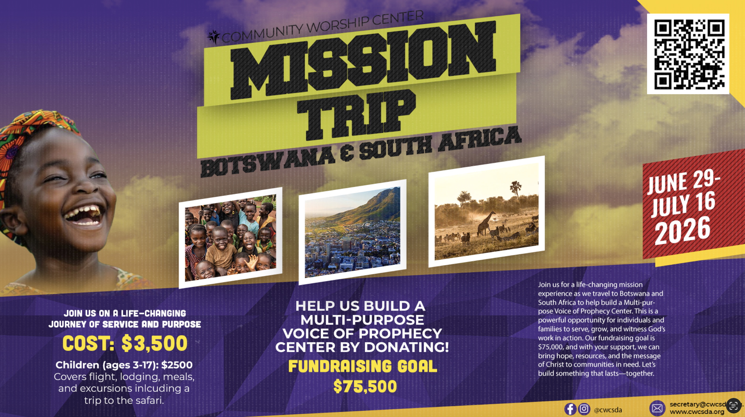 Africa Mission Trip Digital Applications are available on the website at https://cwcsda.org. It’s located directly on the homepage. + Add to Google Calendar + iCal / Outlook export Date Jun 29 2026 Time All Day Location South Africa South Africa Category Local Church Share this event