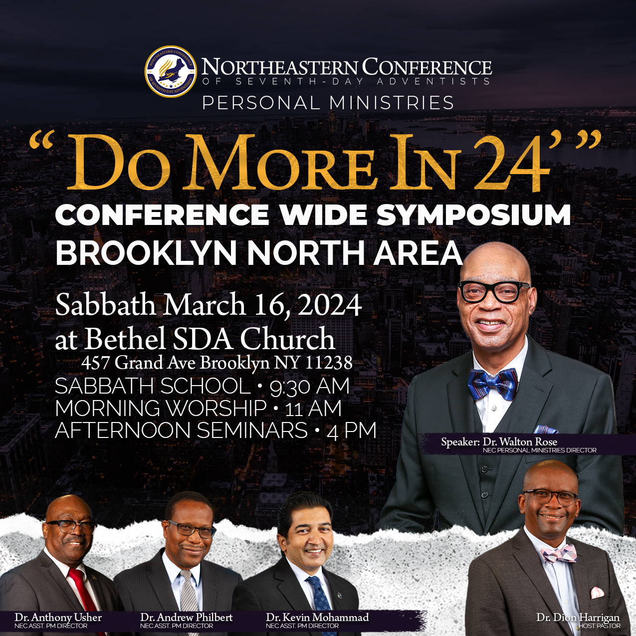 PM Brooklyn North Symposium + Add to Google Calendar + iCal / Outlook export The event is finished. Date Mar 16 2024 Expired! Time All Day Location Bethel Seventh-Day Adventist Church, 457 Grand Ave, Brooklyn, NY 11238, USA Category Conference wide Personal Ministries Speaker Dr. Walton Rose Dr. Walton Rose Share this event