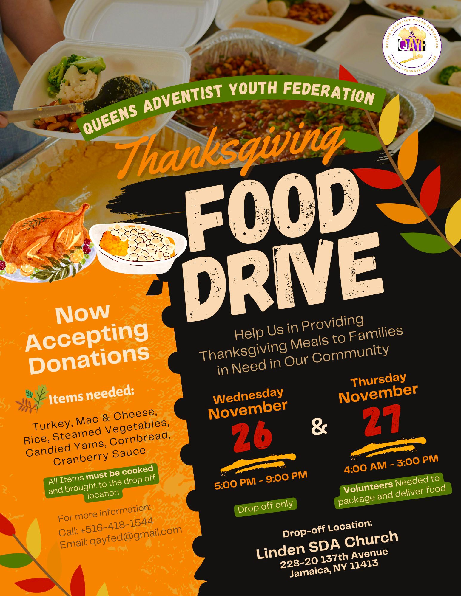 Queens Adventist Youth Federation – Food Drive + Add to Google Calendar + iCal / Outlook export Date Nov 26 - 27 2025 Time All Day Category Local Church Share this event