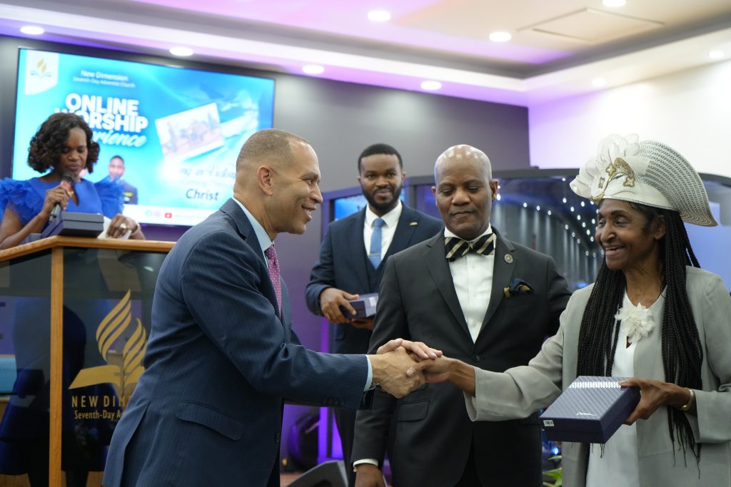 Church clerk Tanya Hanuszczak warmly welcomed members and visitors, noting that the restoration represented not only a physical transformation but also a renewal of mission and commitment. Distinguished guests included The Honorable Hakeem Jeffries, Minority Leader of the U.S House of Representatives, Dr. Nicardo Delahaye, Executive Secretary of the Northeastern Conference, and Dr. Brian McDonald, CFO of the Northeastern Conference. Greetings were also shared from the Honorable Hakeem Jeffries, who described the church as a “shelter in the time of storm.